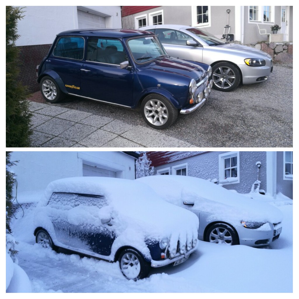 För en vecka sen var det strålande sol och 8 grader varmt och jag köpte en sommarbil (till) ! Idag är det minus och snö.