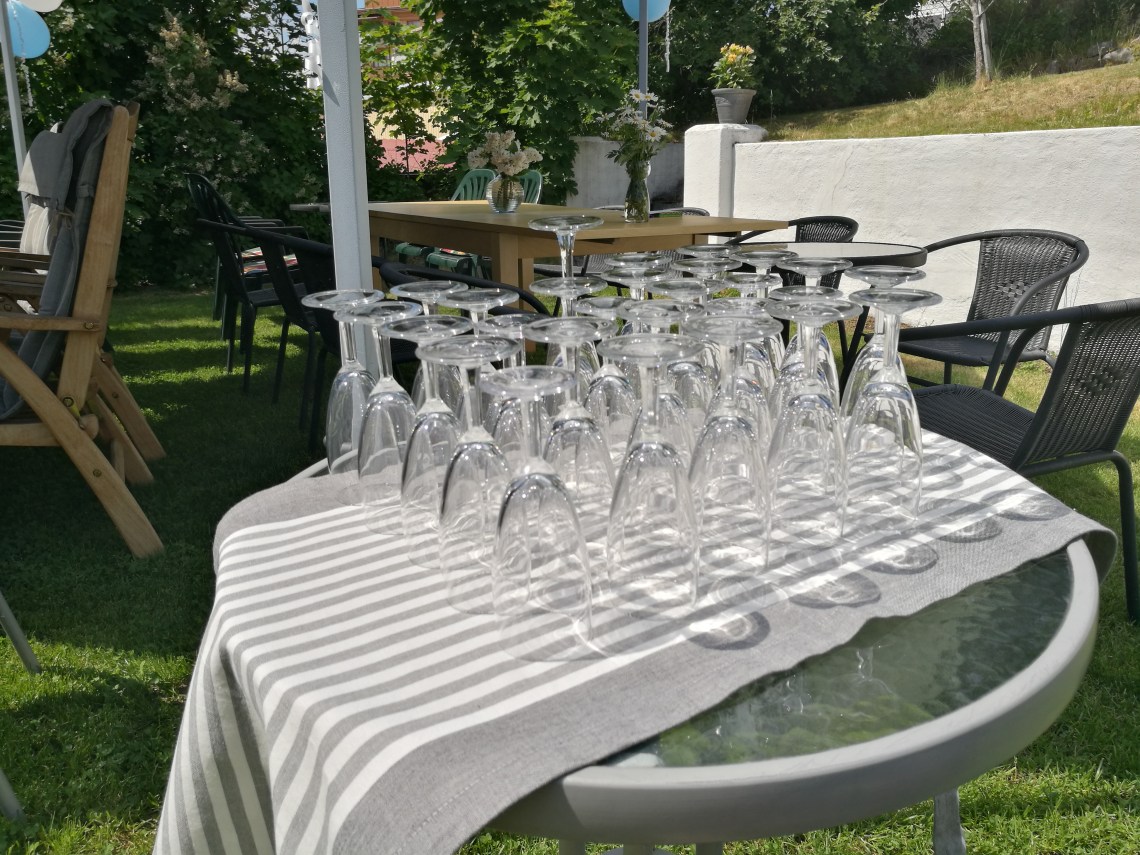 Sen var det mottagning hemma i trädgårn med släkt och vänner. (Som vi så ofta haft) Och det är första gången vi träffar våra ”gamla vänner” och släkt samtidigt sen Alberts begravning. Vissa har ju jag träffat och inte Jessie och omvänt. Så det är känslomässigt laddat men kul. Allt är planerat in i minsta detalj för att det skall flyta enkelt, men framförallt för att det skall bli som Jessie vill ha det. Bubblet var väl kylt och glasen redo.Vi har planerat o räknat och tittat på skugga i en hel vecka.