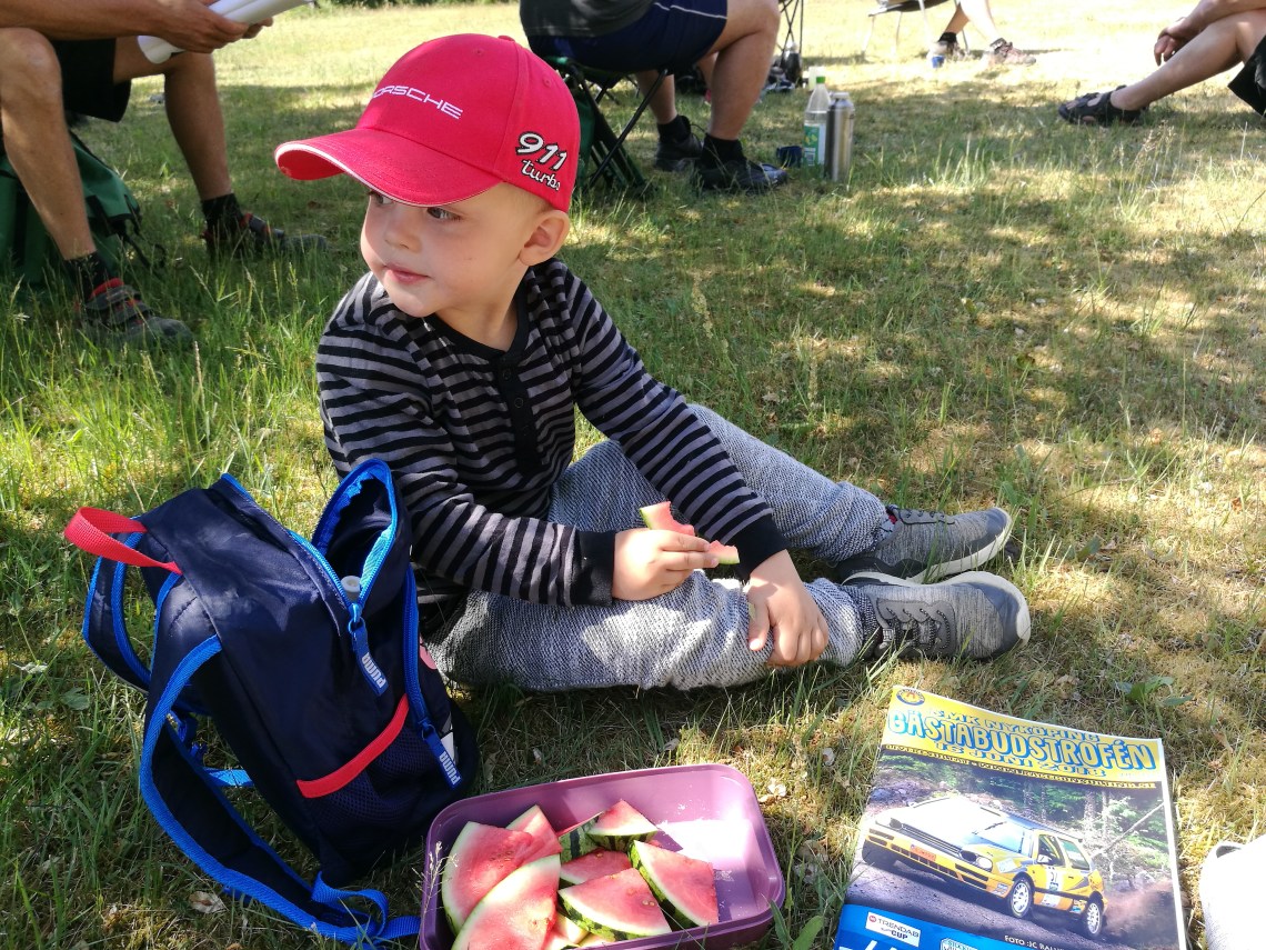 Inte konstigt med en sån förebild. Tyvärr så orsakade en olycka i ”vanliga” trafiken ett stopp på nån timme så vi hann se ca 10 bilar. Men en glad fyra åring är inte ledsen för det. När han sitter i mitt knä så säger han- Peter, du är skäggig ! Ja det stämmer nog.. Det går 10 sekunder, – Du har ju skägg i näsan med !!!!😆😆😆