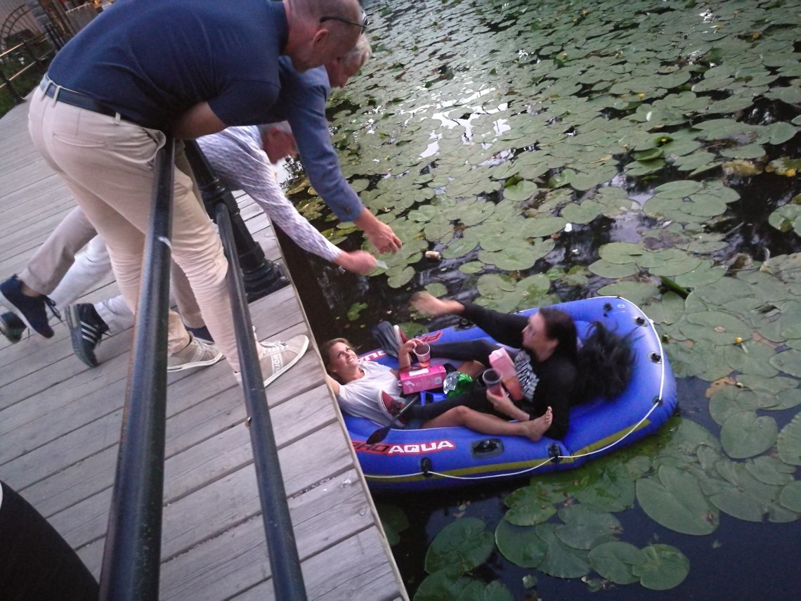 När vi gick från Frimis ikväll så hör vi att det låter under bron o två tjejer glider fram i en gummibåt ! Med varsin box med vin. De hade åkt i tre timmar. En så underbar grej.😆😆