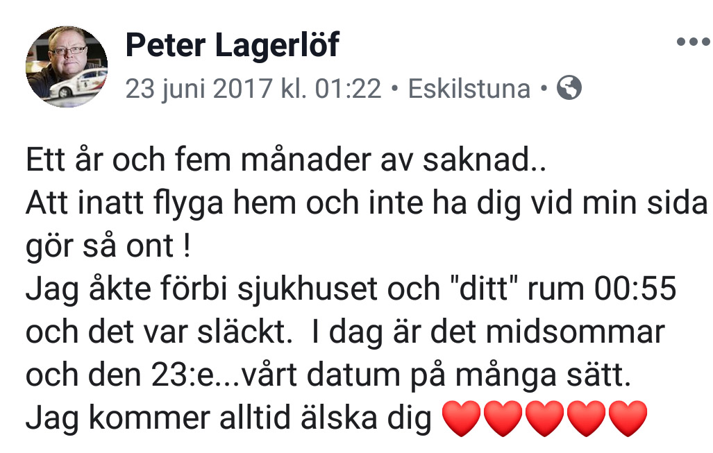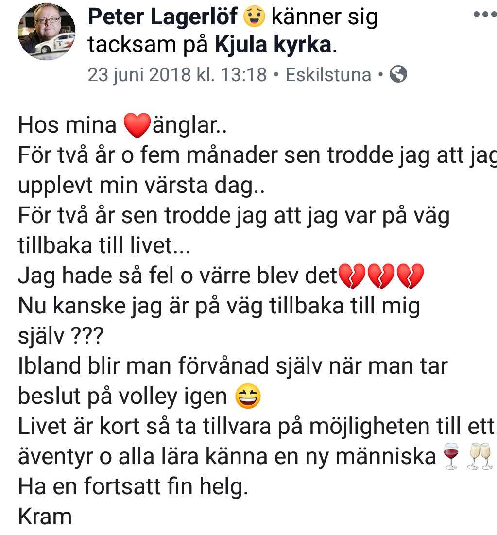 Midsommar är ju för många en helg som har en sanslöst massa minnen och stora förväntningar. Både bra o dåliga och det känns fortfarande fel för mig att åka själv till vänner och fira. Jag kommer alltid sakna att inte Milla är med.. Det bara är så.. Skillnaden nu kanske är att jag har lite lättare att prata om det. Eller exempelvis när nån frågar, hur känner du Fredrik o Ulrika där jag var i fredags. Jo min fru som gått bort var…