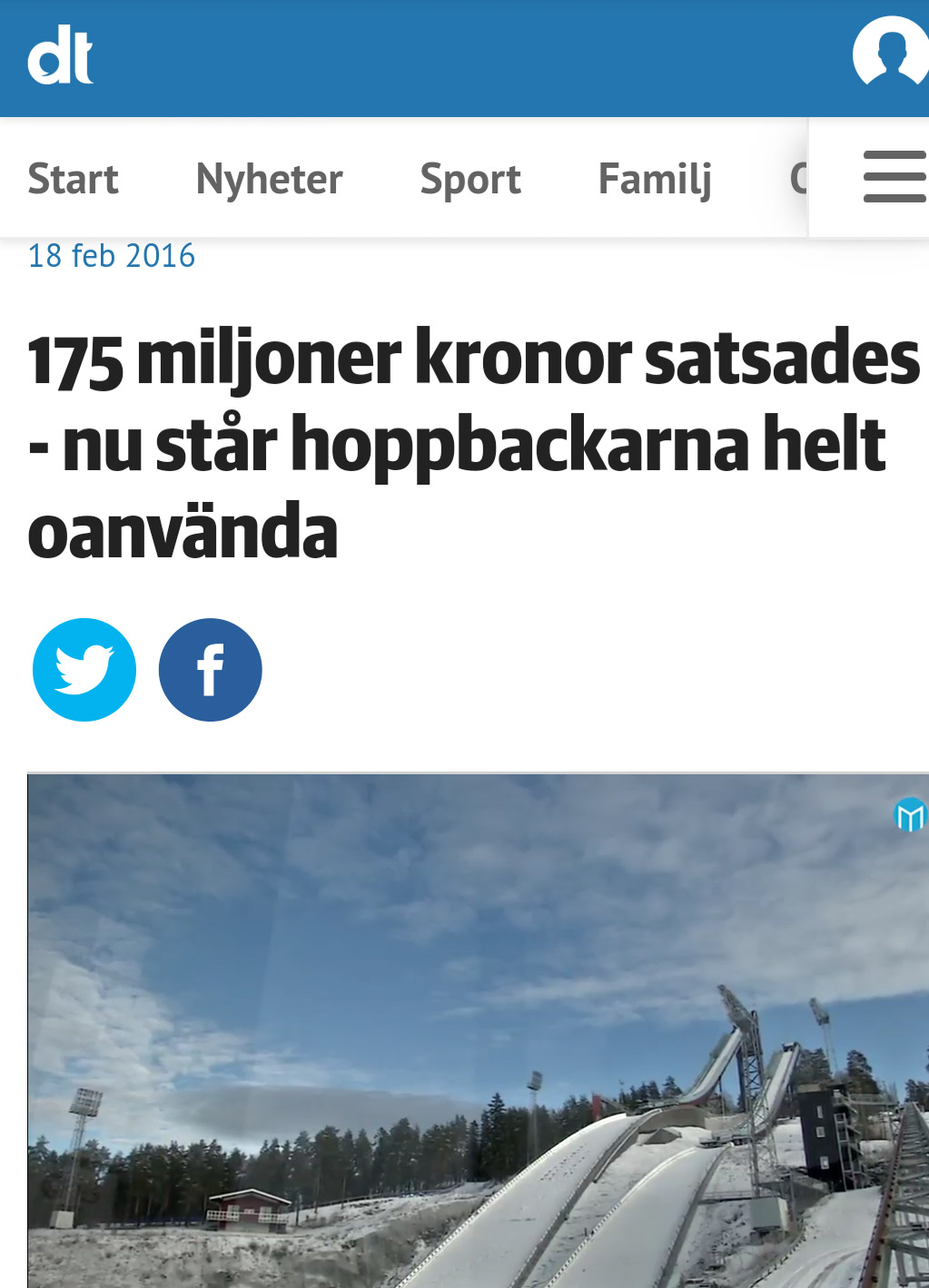 I Falun står två monument över korkade investeringar. Två hopppbackar ! Hur många utövare har vi i Sverige? Hur många tävlingar? Ibland måste man säga nej! Detta är inte ok att bygga. Det är sannolikt billigare att skicka både utövare o publik till Lillehammer eller Oslo i taxi..