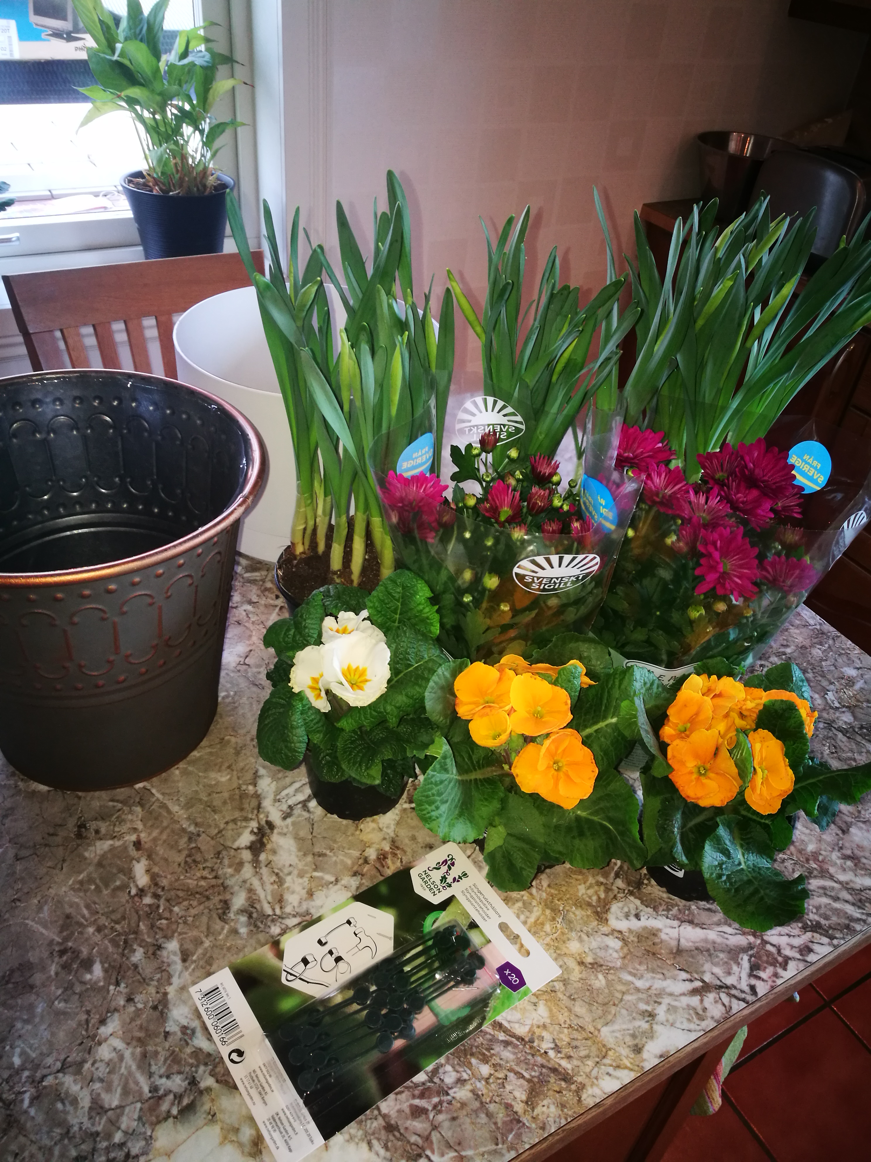 Idag pĂ„ vĂ€g hem hoppade jag in pĂ„ blomsteraffĂ€ren o skulle köpa krokar till nĂ„gra klĂ€ngvĂ€xter. Jag kom ut med tvĂ„ sĂ€ckar jord o 8 blommor, nĂ„gra krukor och krokar.đ.