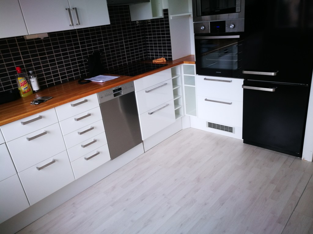 I helgen så har Jag och Jessica fixat i deras lägenhet (har varit uthyrd i två år) som nu ska säljas. Hyresgästen lämnade nyckel 15:00 i lördags och vi började byta golv direkt. Igår em var vi klara med golv, balkong mm.