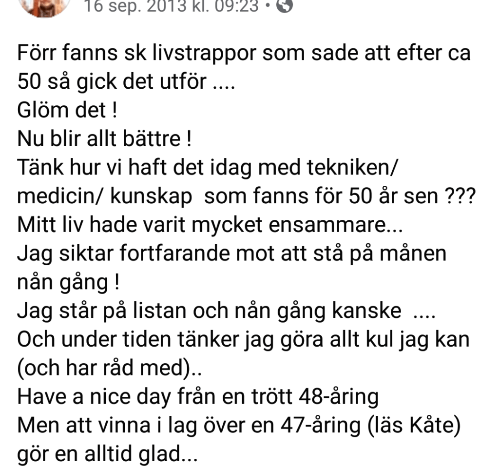 Och som vuxen man sĂ„ dukar jag efter Ă„lderđđMen Ni kan aldrig vara sĂ€kra pĂ„ vad som hĂ€nder. Som Ni ser sĂ„ Ă€r mĂ„nfĂ€rden fortfarande kvar pĂ„ listan och vem vet det kanske blir party igen….