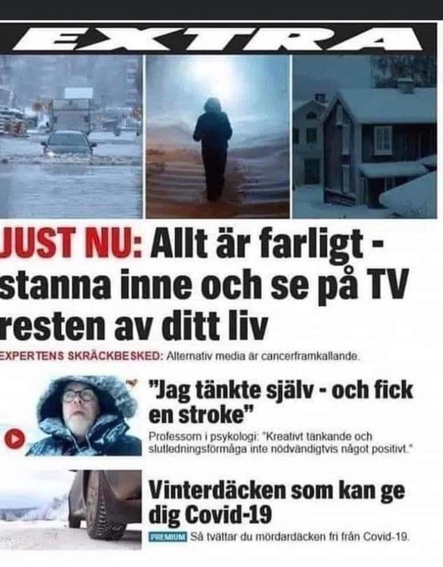 Adrian sitter på verandan med gasolbrännaren på och funderar. Det enkla är ju att frågasätta medias ständiga katastrofrubriker. Ett klassisk youtube klipp är när det står en uppjagad reporter (hans mål är nog att bli krigsreporter) i Göteborg och berättar att all kollektivtrafik står still och i bakgrunden passerar en spårvagn.😂