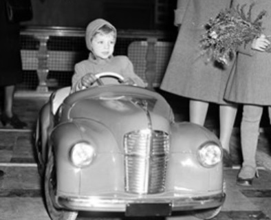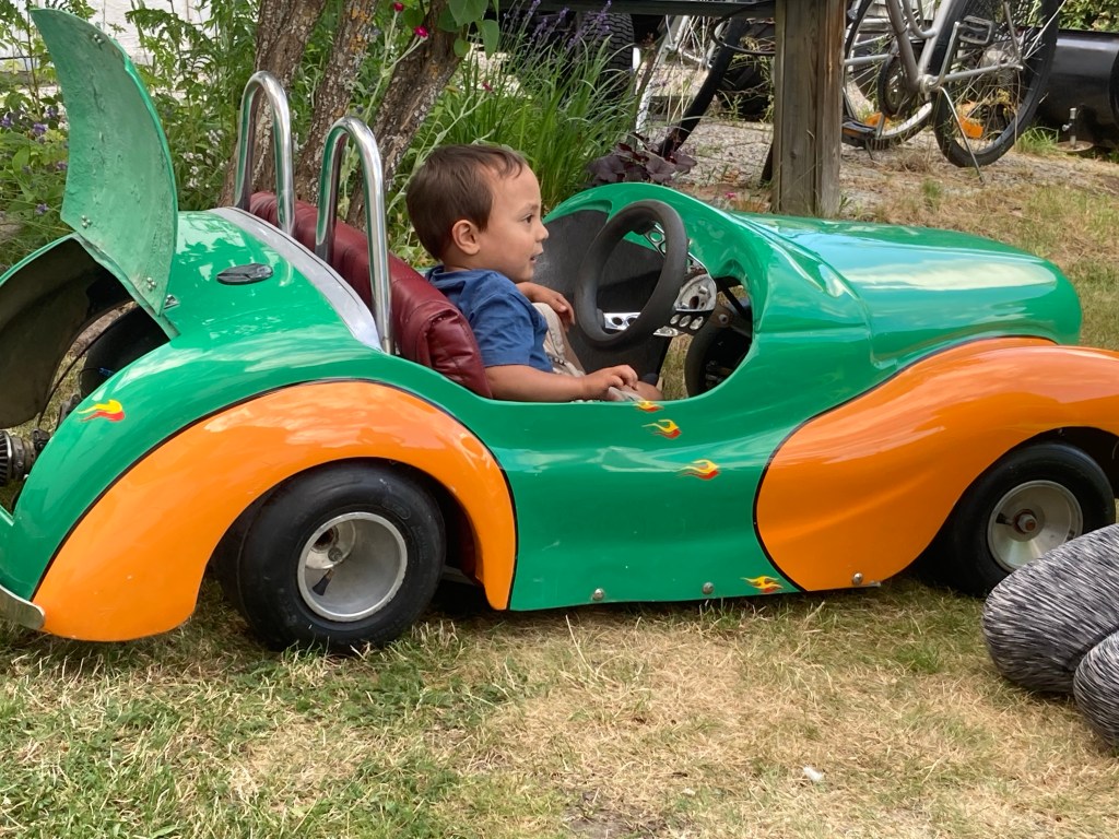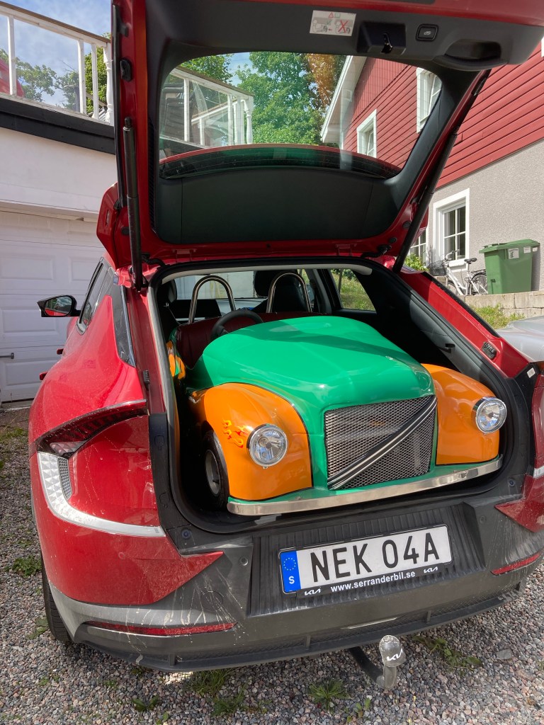 Detta är kungen i en Austin A35 trampbil. Jag hade i veckan messat på en annons. Idag visade det sig att det var en gammal kund till oss som jag hjälpt för några år sen. Han hade för länge sen kopierat kungens bil o gjort trampbilar, men en som var ombyggd och med gokart-ram och motor mm stod kvar orörd sen 15 år..,